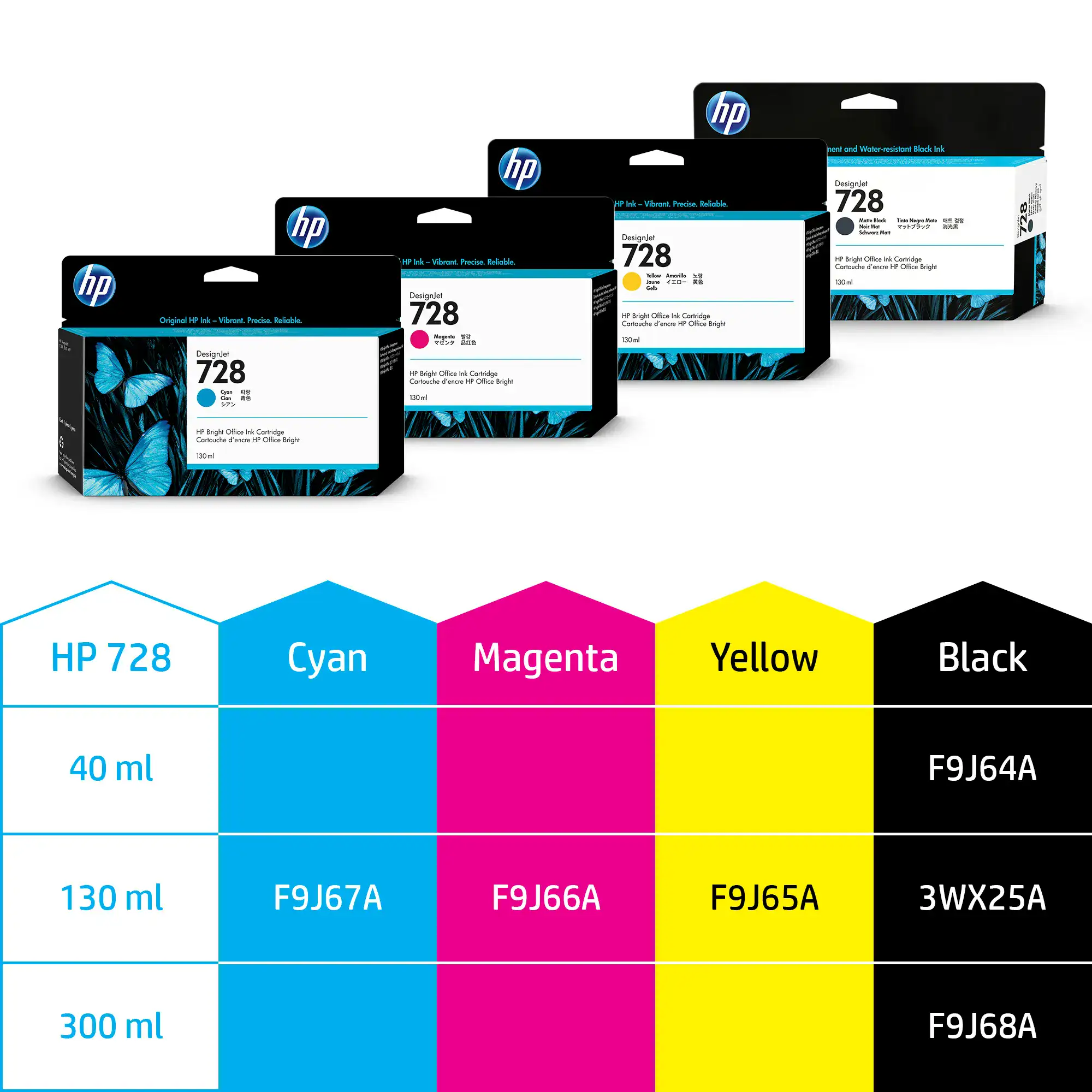 HP 728 inks are specifically engineered for the T730 and T830 series. Available in multiple capacities (40ml, 130ml, 300ml), they offer flexibility for different print volumes and work seamlessly with the HP 729 printhead.